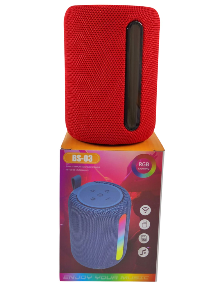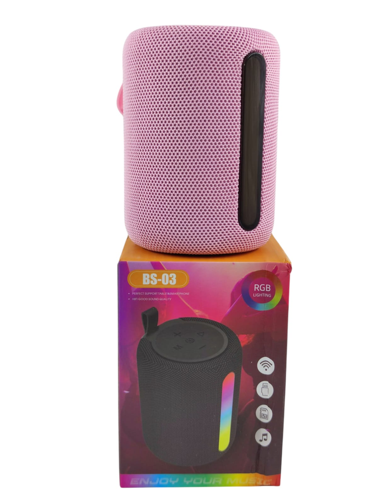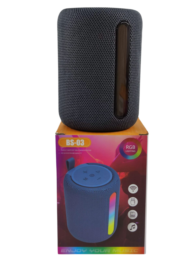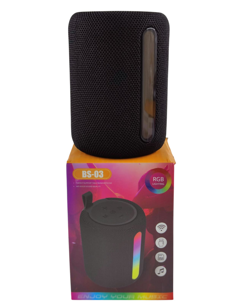 Parlante Inalámbrico BS-03 con Luces RGB Sonido estéreo Hi-Fi con graves mejorados Luz LED RGB que acompaña tu música Manos libres con micrófono incorporado Bluetooth + entrada USB y microSD Batería de larga duración (2 a 4 horas según volumen) Diseño portátil, resistente y fácil de usar
