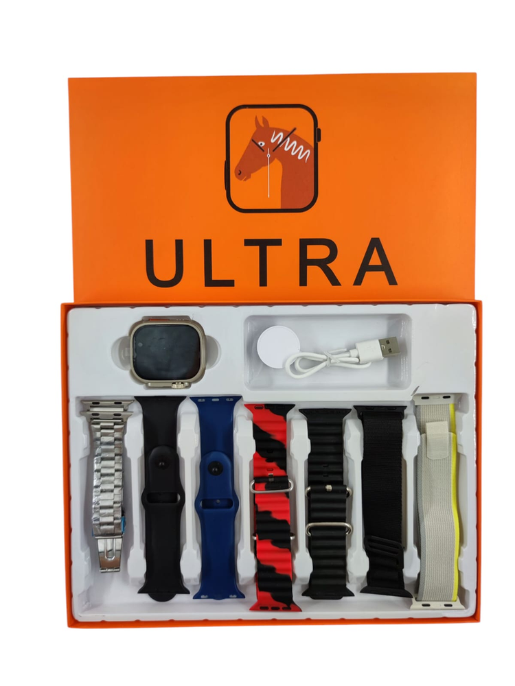 Reloj smartwatch tipo ULTRA presentado en box premium, ideal para uso diario o para regalo. El set incluye el reloj, cargador y varias correas para cambiar de estilo cuando quieras. Características principales: Smartwatch tipo Ultra con pantalla rectangular. Incluye 6 correas intercambiables (silicona, metálica y tela/nylon, varios colores). Cargador magnético con cable USB incluido. Presentación en estuche rígido, listo para regalar o revender. Monitor de ritmo cardíaco en tiempo real. Registro de presión arterial y oxígeno en sangre (SpO₂). Contador de pasos, distancia y calorías. Modo deporte con varias actividades. *Monitor de sueño (sueño ligero/profundo y tiempo total).