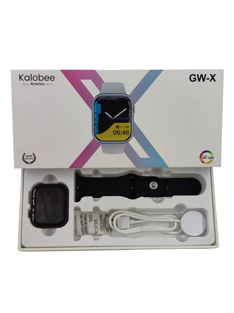 Smartwatch Kalobee GW-X con diseño rectangular moderno y pantalla AMOLED a color. Características principales: Pantalla táctil brillante tipo AMOLED. Correa de silicona negra cómoda para uso diario. Incluye cargador magnético con cable USB. Presentación en caja rígida, ideal para regalo o reventa.