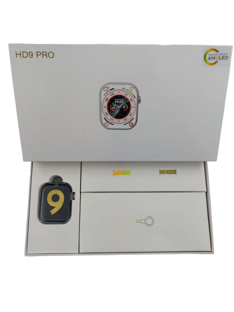 Smartwatch HD9 Pro con diseño tipo reloj inteligente moderno y pantalla AMOLED a color. Características principales: Pantalla táctil AMOLED de alta definición. Caja rectangular estilo premium. Incluye correas intercambiables y cargador magnético (presentación en compartimentos internos). Estuche rígido elegante, ideal para regalo o reventa.