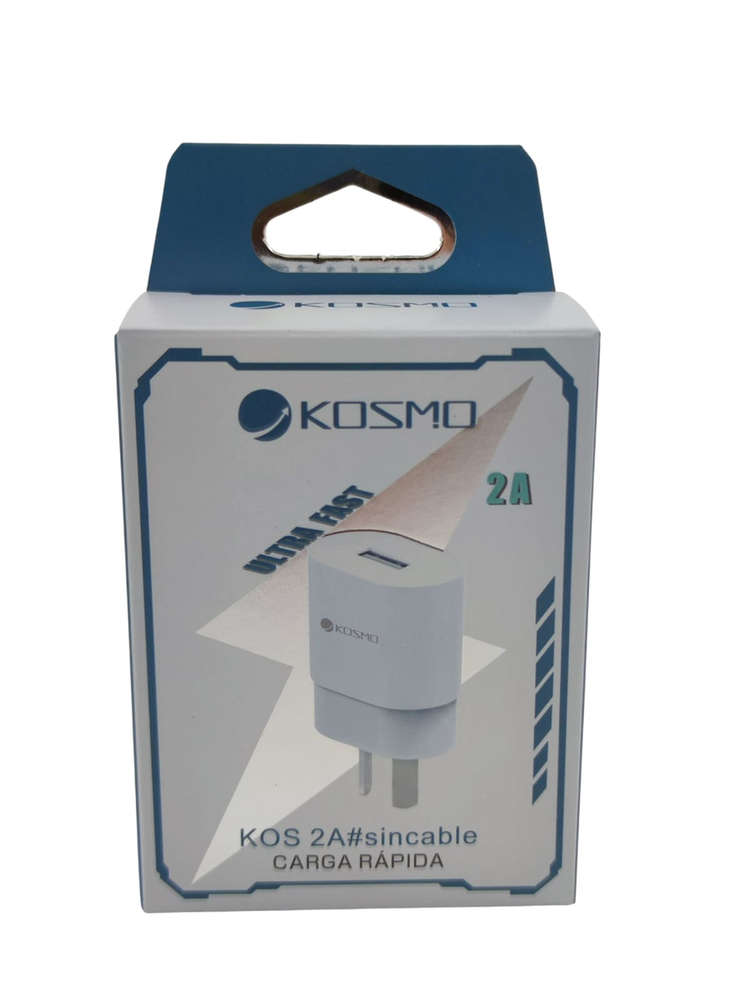 Cargador de pared Kosmo KOS 2A de carga rápida, ideal para celulares y dispositivos pequeños. Características principales: 1 puerto USB de salida. Corriente máxima 2A. *No incluye cable (compatible con cualquier cable USB estándar).