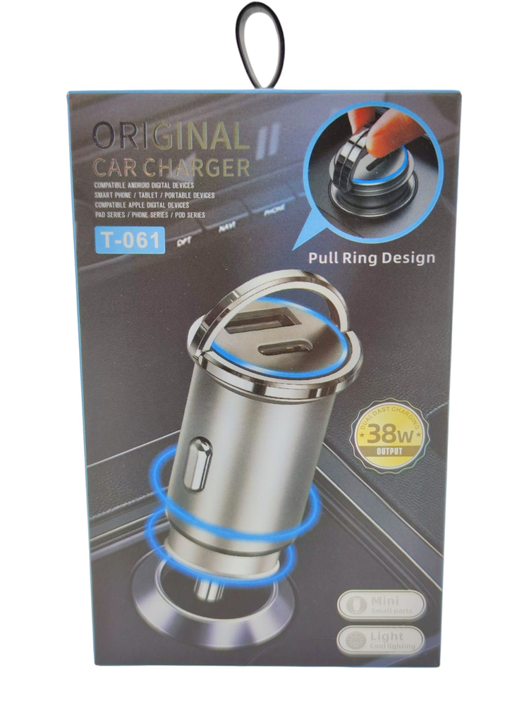 Cargador de Auto Mini Metálico 38W - Diseño "Invisible" con Anillo Diseñado para integrarse perfectamente en tu vehículo. Este cargador modelo T-061 es ultra compacto y queda totalmente al ras del encendedor, ofreciendo una estética limpia y ordenada. Gracias a su sistema "Pull Ring" (anillo plegable), puedes extraerlo fácilmente cuando lo necesites. Lo más destacado: Potencia 38W: Carga rápida dual para tus dispositivos (Android y Apple). Diseño Mini: No sobresale del tablero, ideal para espacios reducidos. Pull Ring: Anillo metálico abatible para una fácil extracción. Cuerpo Metálico: Aleación de zinc resistente y disipadora de calor. *Iluminación LED: Luz suave azul para ubicar los puertos en la noche sin encandilar.