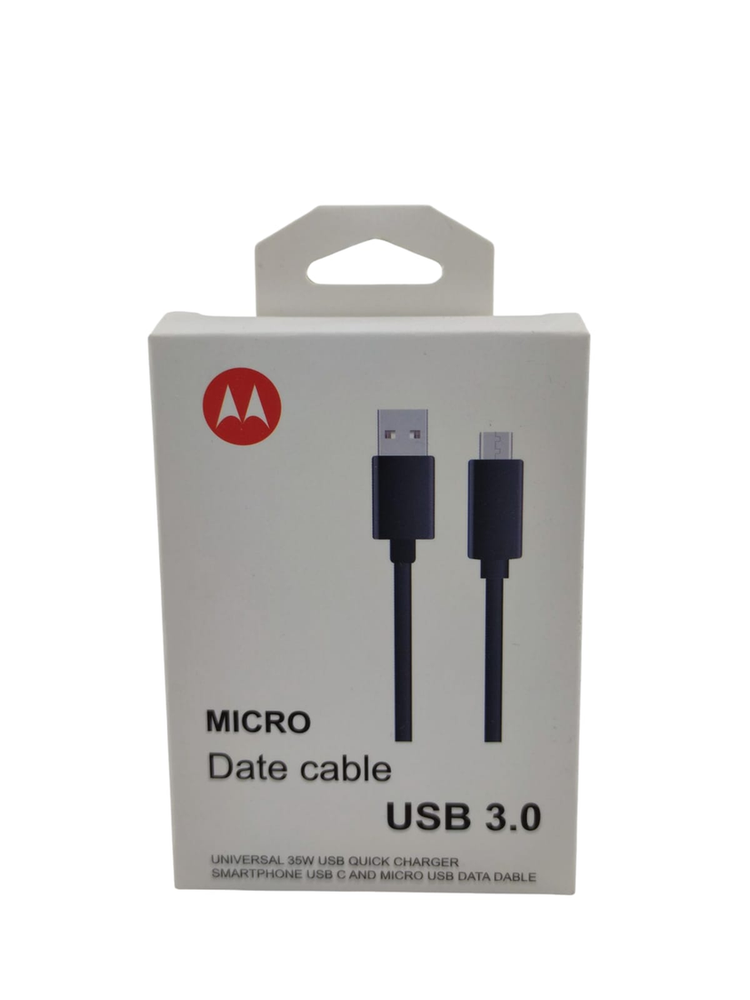 Cable Motorola Micro USB - Soporta Carga Rápida 35W Cable de datos y alimentación de alto rendimiento. Marca: Motorola (Packaging). Conector: Micro USB / V8. Estándar: USB 3.0 (Alta velocidad de transferencia). Capacidad: Apto para cargadores "Quick Charger" de 35W. *Color: Negro.