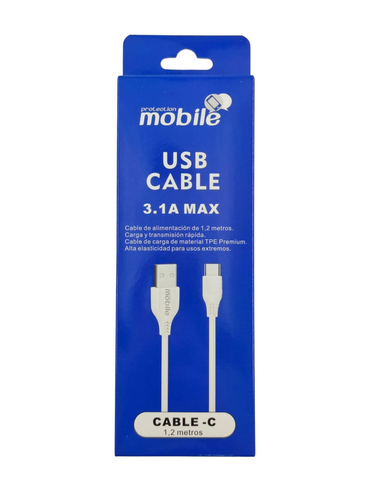 Cable Datos y Carga USB Tipo C - 3.1A Cable de alimentación y sincronización para smartphones de nueva generación. Modelo: Protection Mobile (Caja Azul). Ficha: USB-C (Type C). Corriente: 3.1A Max. Longitud: 120 cm. Material: TPE ReForzado. Función: Carga rápida + Transferencia de archivos.