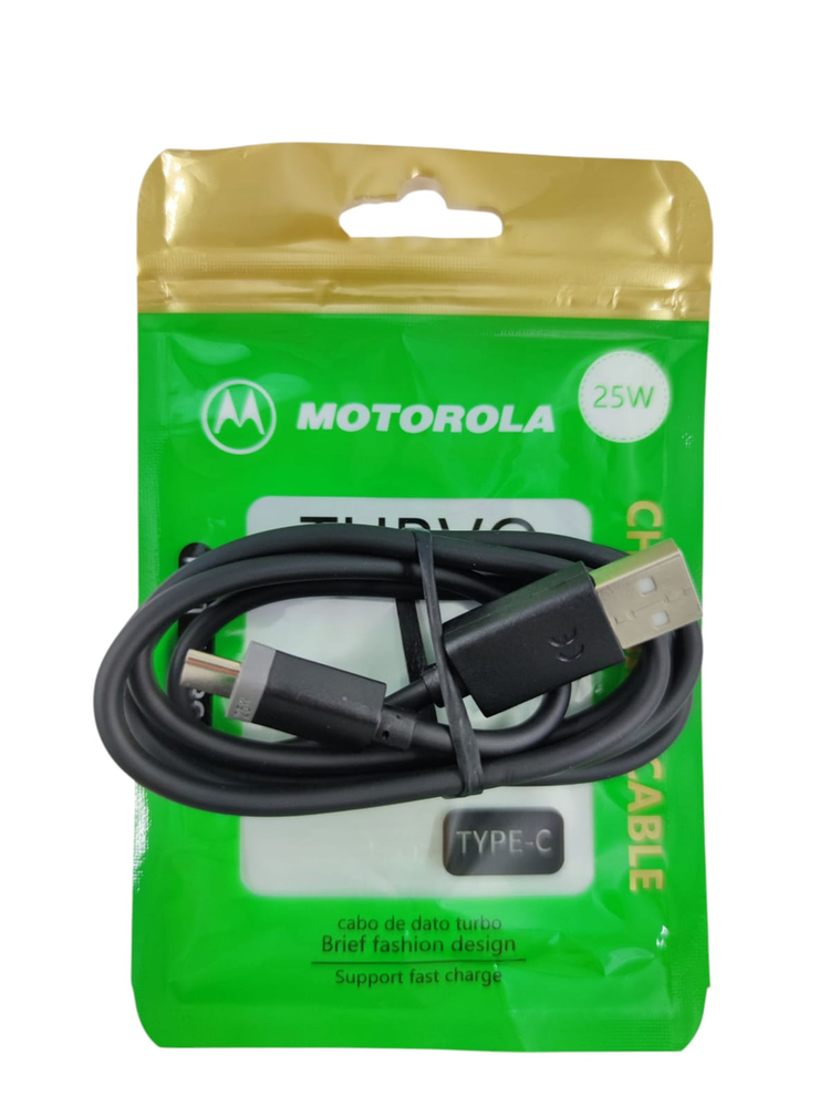 Cable Motorola TurboPower Tipo C - 25W Carga Rápida Saca el máximo provecho a tu cargador Turbo. Este cable de datos y carga está diseñado específicamente para soportar la tecnología TurboPower de Motorola, soportando hasta 25W de potencia. Es el reemplazo ideal para tu cable original perdido o dañado. Compatible con toda la línea moderna de Moto G (G30, G50, G60, G71, etc.), Motorola Edge y cualquier dispositivo con puerto USB Tipo C. Características Tecnología: Soporta TurboPower / Carga Rápida hasta 25W. Conector: USB Tipo C (Reversible). Compatibilidad: Optimizado para Motorola, pero funciona excelente en Samsung y Xiaomi. Funciones: Carga de batería y transferencia de archivos a PC. Presentación: Empaque sellado tipo bolsa (Bulk). Color: Negro clásico.