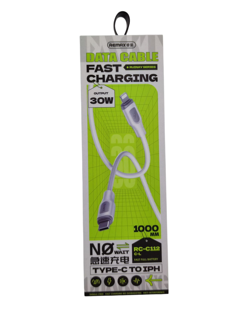 Cable Remax Tipo C a iPhone (Lightning) - 30W Power Delivery Carga tu iPhone hasta el 50% en solo 30 minutos. Este cable Remax RC-C112 está diseñado con tecnología PD (Power Delivery) de 30W, lo que permite aprovechar al máximo los cargadores rápidos modernos con entrada Tipo C. Es el complemento ideal para iPhone 11, 12, 13 y 14. Su diseño de la serie "Ruinay" en color negro y amarillo no solo es estético, sino que cuenta con un chip inteligente que evita el sobrecalentamiento y protege la salud de tu batería. Características Destacadas: Conexión: Tipo C a Lightning (iPhone). Potencia: 30W (Carga súper rápida para iPhone y iPad). Tecnología: PD (Power Delivery). Seguridad: "No Overheating" (Control de temperatura). Diseño: Anti-enredos y resistente. Largo: 1 Metro.