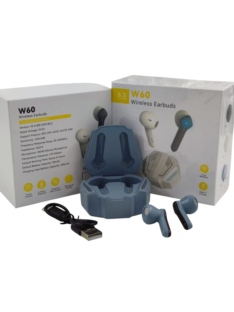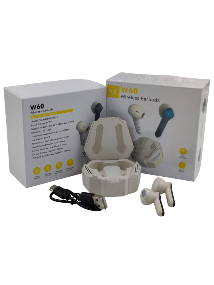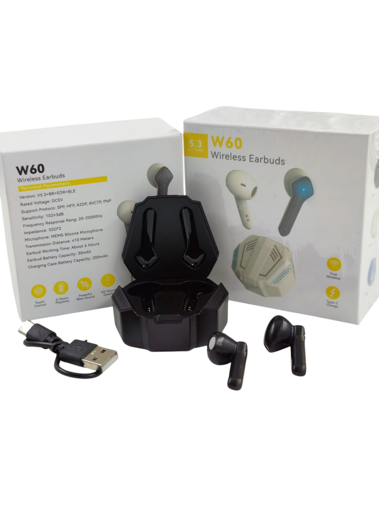 Auriculares Inalámbricos W60 Wireless Earbuds – Estilo Gamer Auriculares TWS modelo W60, con estuche de carga rígido de diseño gamer, ideales para música, juegos y uso diario. Características importantes